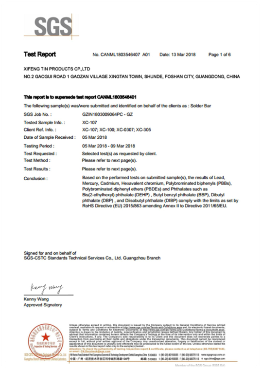 SGS Report of Xi Feng Tin Products Co., Ltd Tin Lead Free Solder Bar